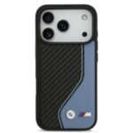 BMW PU Leather & Carbon Case with Colored Line Stitch for iPhone 17 Pro Drop Protection Slim Profile Easy Snap On MagSafe Compatible Black Blue