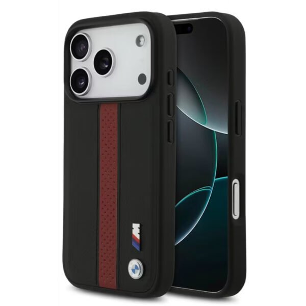 BMW PU Leather Case with Perforated Stripes & Metal Logos Slim Profile Compatible with MagSafe System Easy Snap On Made for iPhone 17 Pro Black Red