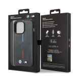 BMW-IPHONE 14 PRO MAX – PU LEATHER GREY M COLLECTION QUILTED PU CASE WITH HOT STAMPED TRICOLOR STRIPE AND METAL LOGOS