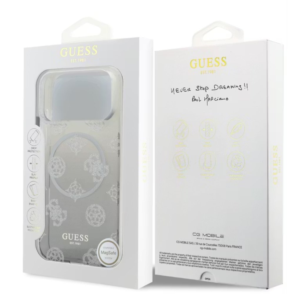 The Guess MagSafe PC & TPU Case with Gradient Peony & Glitter Pattern in Black is the perfect add-on to improve the appearance and protect your iPhone 17 Pro Max. This cover adds a chic touch to your gadget with its gorgeous gradient peony design and hint of glitter. It provides both simplicity and functionality. Its MagSafe compatibility ensures easy attachment to MagSafe chargers and accessories. Your phone stays sleek and stylish because of its thin design. It also provides reliable security. The case’s lightweight construction and comfortable grip make it easy to use all day long without adding extra bulk. The simple snap-on design makes installation safe and rapid. The case uses eco-friendly materials. This demonstrates a commitment to environmental protection. The Guess MagSafe PC & TPU Case with Gradient Peony & Glitter Pattern adds style and function to your iPhone. It’s perfect for those who want protection and flair.
