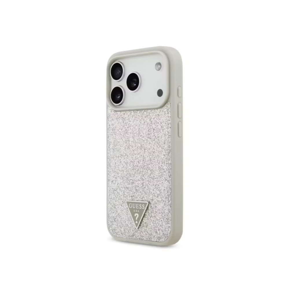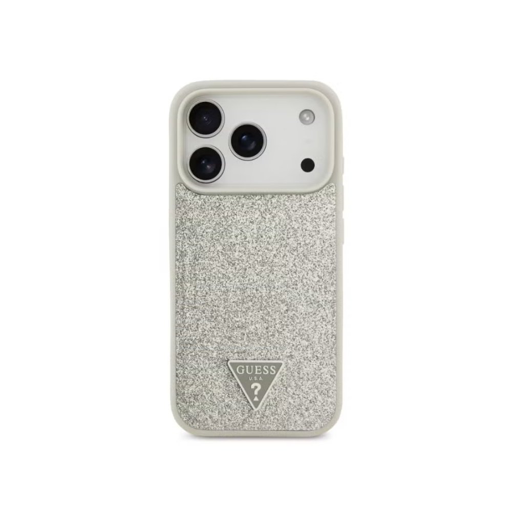 GUESS iPhone 17 Pro Max MagSafe Case PU Leather Fixed Glitter Case With Triangle Logo Silver