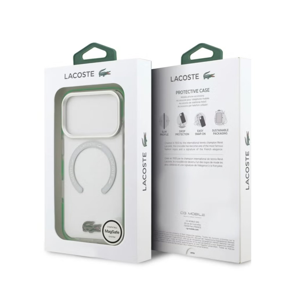 With MagSafe compatibility, the case supports seamless wireless charging and allows effortless attachment of MagSafe accessories without removing the cover. The transparent construction highlights the phone’s original design, while the Lacoste branding gives it a signature premium identity. Offering reliable protection and sophisticated style, this case is ideal for anyone seeking a balance of fashion and functionality.